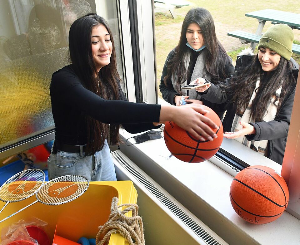 Unter dem Projektnamen „Wir wollen wieder in die Schule“ standen bemerkenswerte 8.875,54 Euro zur Verfügung: Geld genug, um einiges zu beschaffen. Falk Peters, Integrationsfachkraft des DRK an der Comenius-Schule hat zusammen mit den Lehrkräften überlegt, wie man am besten den Spaß der Kinder an der Schule steigern und Corona-Defiziten entgegenwirken kann. Schließlich wurden vier kleine Profifußballtore, vier umfangreiche Bücherkisten sowie mehrere Tonnen mit sportlichem Spielzeug gekauft. Daraus werden gegen Pfand in den Pausen Fuß- und Basketbälle ausgeliehen, auch Badmintonsets, Frisbees oder Springtaue. Erklärter pädagogischer Zweck – die Stärkung von Bewegung im Sozialgefüge. Noch werden die Pausenspielzeuge aus einem offenem Fenster ausgegeben, doch die Schule überlegt derzeit, dafür im Außenbereich einen Ort einzurichten, vielleicht in Form eines Bauwagens.